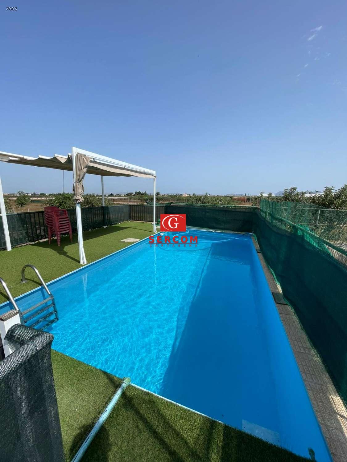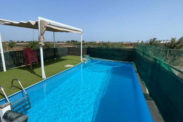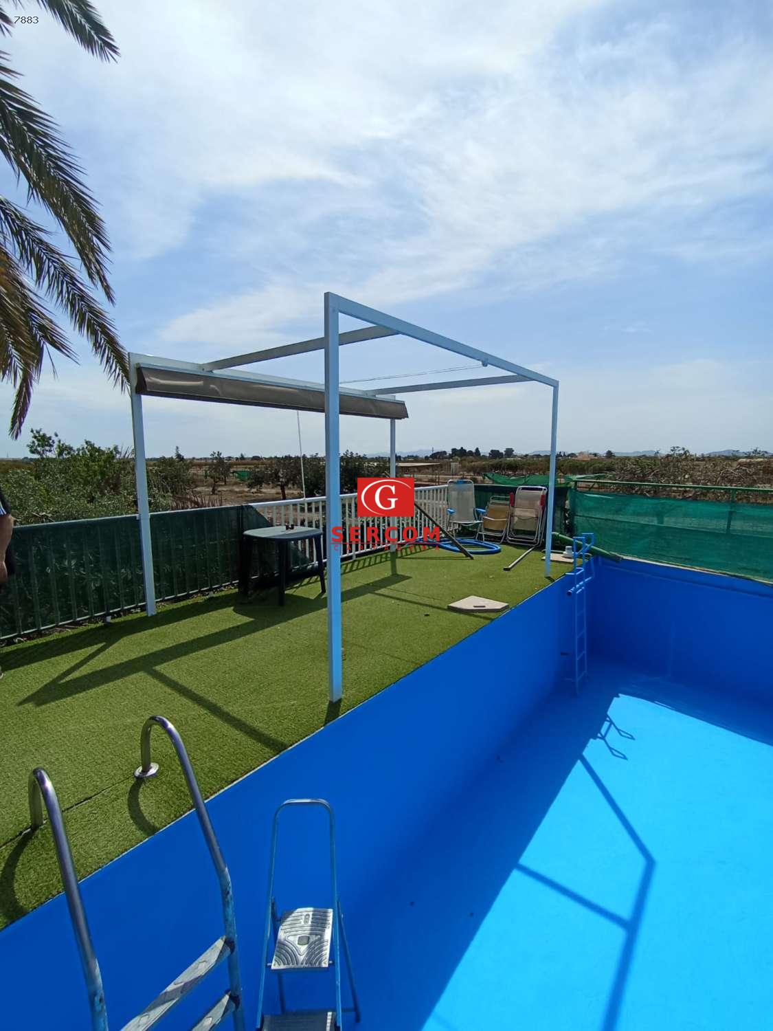 Balsa de riego (≈40 m³), utilizada como piscina en verano, con depuradora y mantenimiento completo.